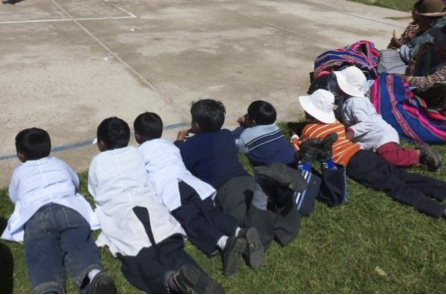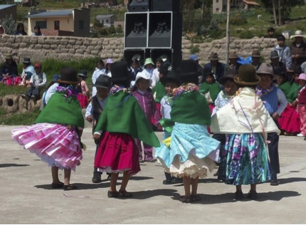 Cusijata school first- grade students perform a traditional dance , "Danza Carnavalito", at the schools 53rd anniversary while other students and parents watch.