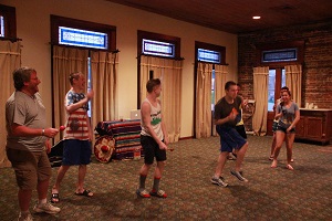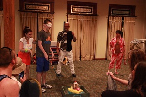 However, the activity did seem to go an hour longer than planned, so we had to post pone the beach for the next day. Instead, we walked around downtown, ate ice cream, and admired the ocean by where many boats were docked ( we got plenty of pictures with the ocean in the backround and some nice boats, don't worry). Finally, at about 6o'clock we headed to our mystery dinner! The theme of the night's mystery was "Mariachi Mystique", and was probably one of the craziest and funniest things any of us have ever seen. Nobody really was sure what we were in for, and the night definitely consisted of laughs the entire time. During some of the skits, people in the choir got to go up and dance with the "Maraiachi Band", beat up a piñata, oh and we can't forget the newly famous Andy who starred as "Rusty" in the mystery. Overall, the day consisted of tons of adventure and ended with a night of a good dinner, mystery, and of course lots of laughs.