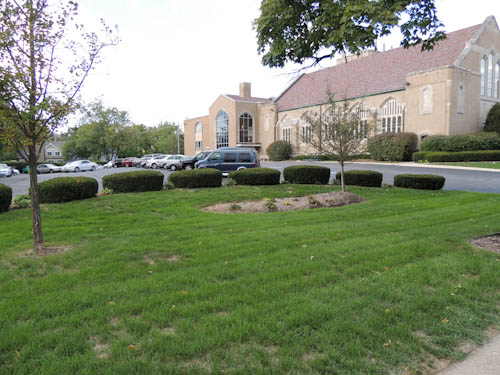 Over the past two years the Environmental Stewardship Work Area (ESWA) at DGFUMC has looked for an area on the grounds of the church to take responsibility for general maintenance, planting, mulching, and overall appearance. During the Spring/Summer of 2011 the group asked the church if they could be responsible for the semi-circle area between the main entrance/exit to the church off of Maple Ave (see picture). After becoming responsible for the area, the ESWA gathered one Spring evening in 2011 to remove weeds, plant new Coral bells (Heuchera), and put down mulch within the area. Over that Summer the group set up a bi-weekly weed removal schedule in which a member of the group would be responsible for removing weeds during their selected time slot.